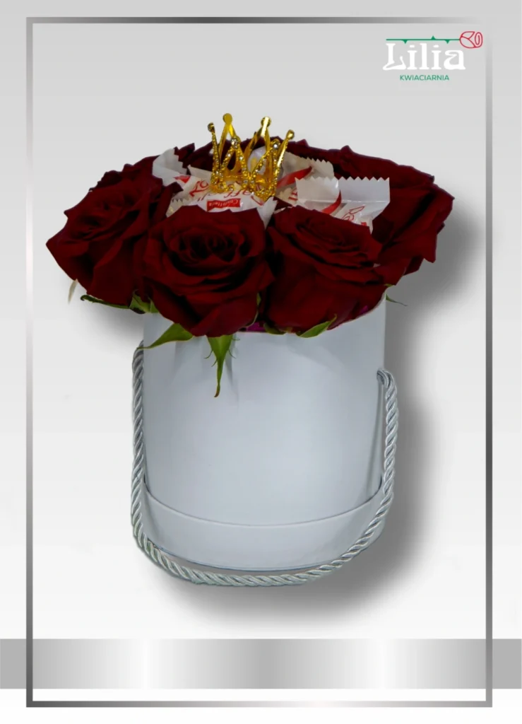 Minimalistyczna, elegancka kompozycja czerwonych róż w białym boxie, uzupełniona subtelnymi dodatkami i dekoracyjną koroną.