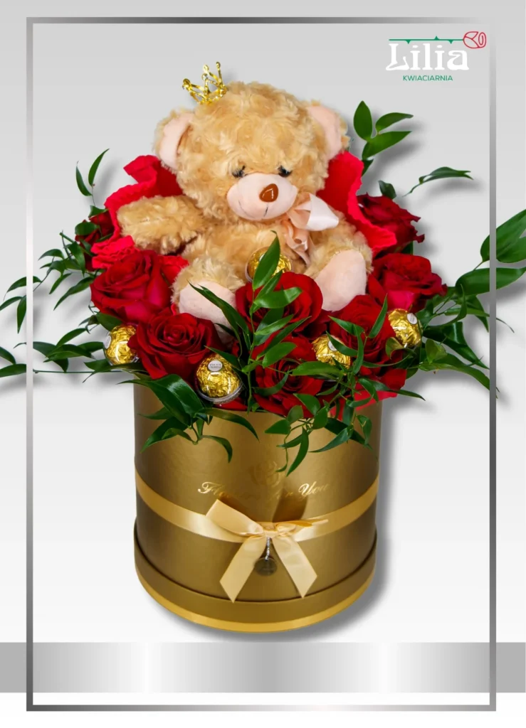 Wyjątkowa kompozycja łącząca klasyczne czerwone róże z uroczym pluszowym misiem. Całość wzbogacona o eleganckie dodatki i słodkie akcenty.