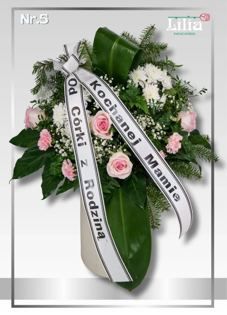 Różowe róże w otoczeniu bieli i zieleni. Bardzo emocjonalna, „rodzinna” kompozycja.