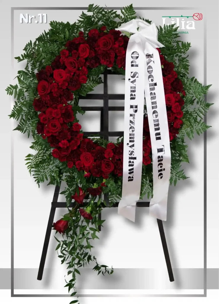 Intensywnie czerwony wieniec z róż i goździków, uzupełniony zielenią. Symbolizuje miłość, szacunek i wdzięczność.