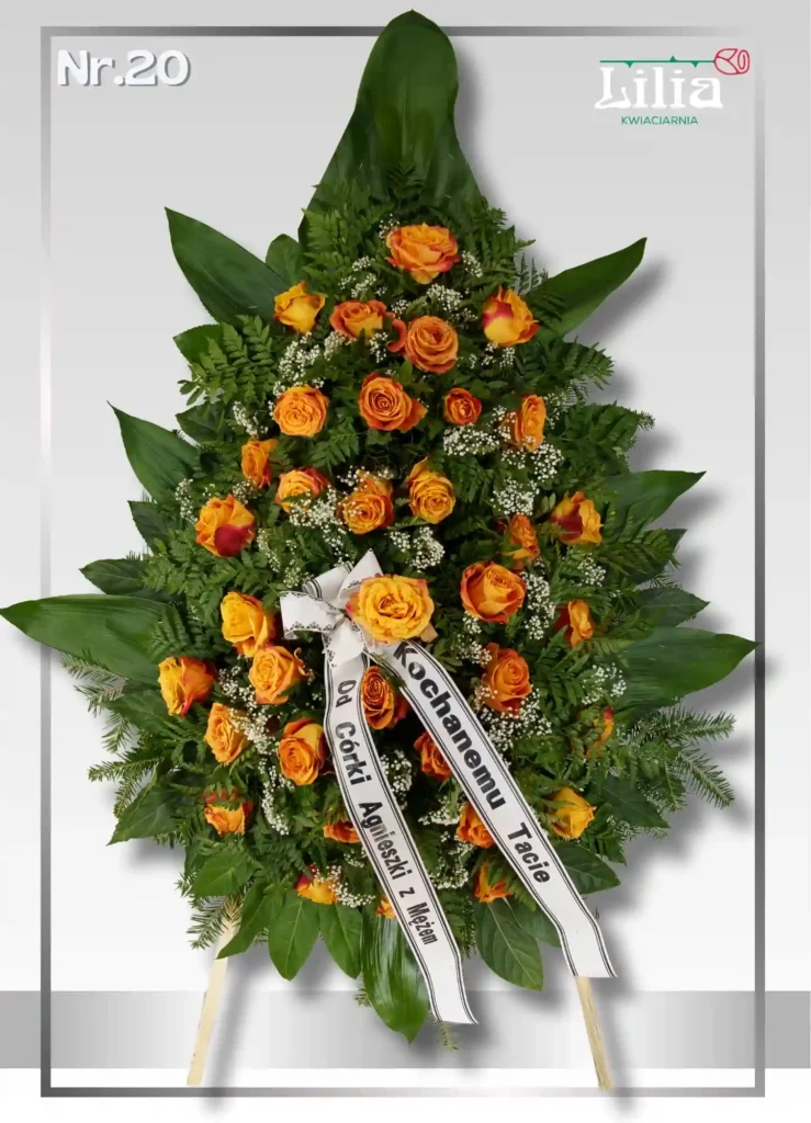 Wieniec w odcieniach pomarańczu i złota, wykonany z róż. Symbolizuje wdzięczność, dobre wspomnienia i pozytywne emocje. Bardzo dobry wybór dla osób, które chcą odejść od klasycznej czerwieni.