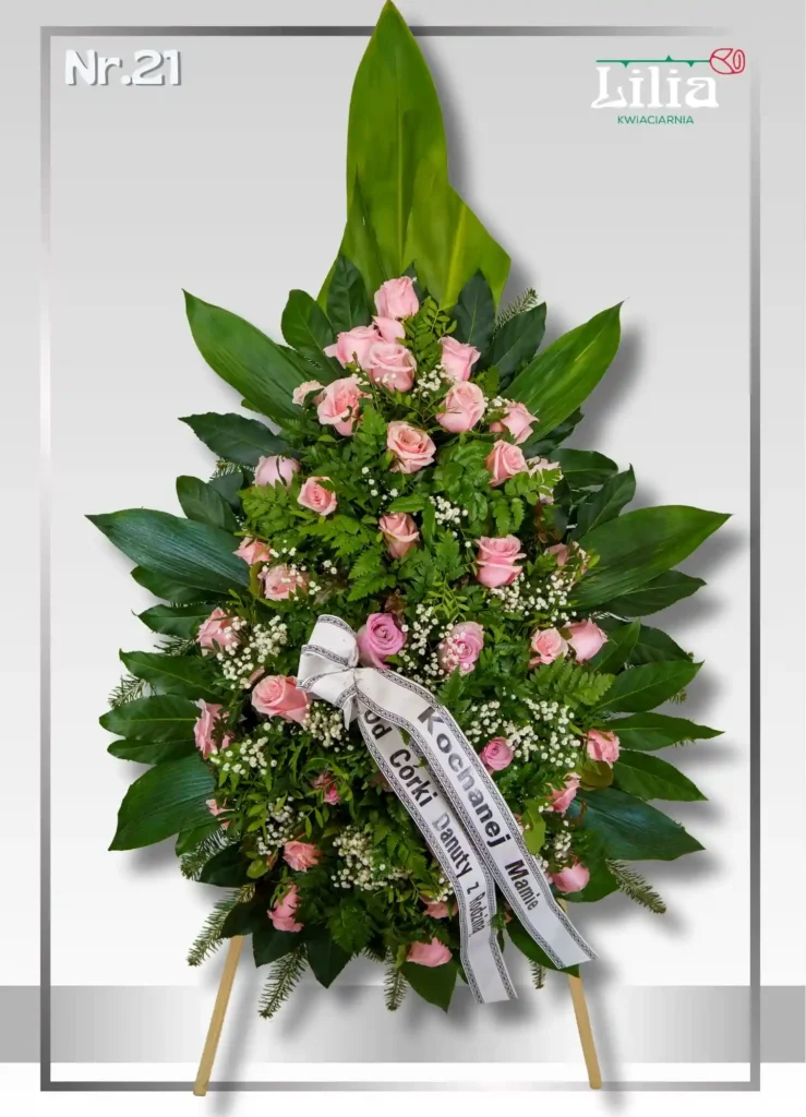 Kompozycja z różowych róż, symbolizujących wdzięczność i bliskość. Subtelna i bardzo estetyczna forma sprawia, że wieniec wygląda lekko i elegancko.