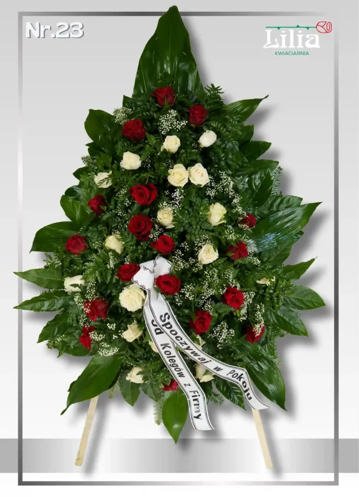 Elegancka kompozycja z czerwonych i białych róż, uzupełniona delikatną gipsówką i bogatą zielenią. Symbolizuje miłość, pamięć oraz szacunek. To jeden z najbardziej uniwersalnych i bezpiecznych wyborów na każdą ceremonię.