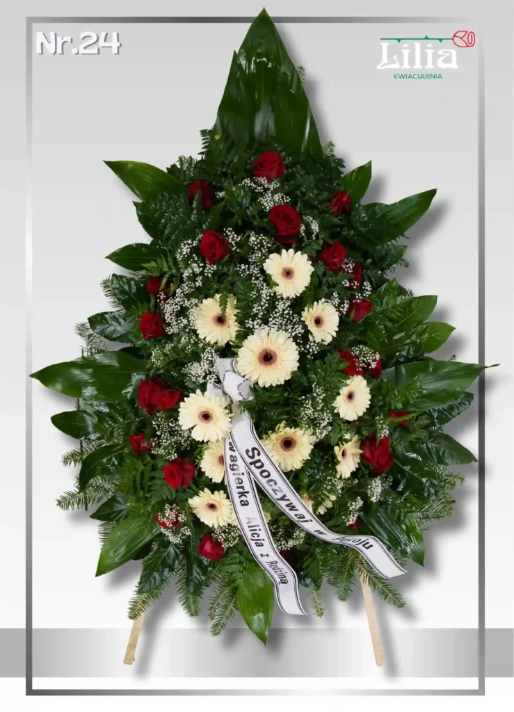 Kompozycja z kremowych gerber, czerwonych róż i subtelnych dodatków. Jasne kwiaty nadają lekkości, a czerwone akcenty podkreślają pamięć i szacunek. Idealny wybór na spokojne, eleganckie pożegnanie.