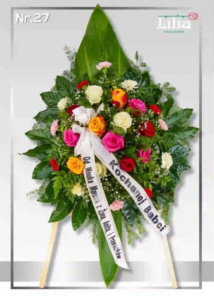 Kompozycja wielokolorowa – różowe, kremowe i czerwone róże tworzą delikatny, emocjonalny charakter. Wieniec symbolizuje wdzięczność, bliskość i ciepłe wspomnienia.